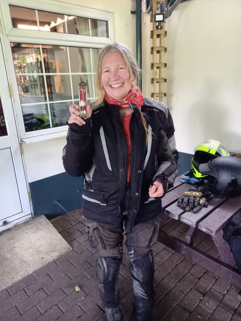 Well that was Dorset Dakar No 3 and somehow I managed to really upset the Gods of Weather with steady rain for 24 hours prior and heavy showers and strong winds during, the only upside being just as we arrived at the Fox & Goose the Sun shone and the showers desisted. So to all of you who came along very well done as the conditions on the Green Lanes were challenging with plenty of water, mud and slippery chalk and the ford at Stratford Tony was seriously deep and a tree had blown down during the night requiring a degree of violence to make a gap for motorcycles. The ride was tougher than I had planned: congratulations on making it to the finish! Our symbolic Clovelly Spoon award was presented to Kirsty Green, whose machine was not particularly unsuitable (the normal category,) elected the Dorset Dakar as her very first venture onto Green Lanes, I am sorry it was such a baptism of fire, a spoon very well deserved.