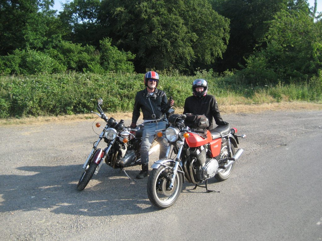 11 bikes plus 4 pillions met at The Halsey Arms for a run of 20miles over Bulbarrow to Winterborne Whitechurch then over Okeford Hill to Okeford Fitzpaine. The roads were very quiet and the views amazing. Unfortunately because I had to get to the Okeford in reasonable time I didn’t have time to take many pictures, but I did manage a quick stop at Bulbarrow to take a snap of the two triples on the run – Laverda and Trident.