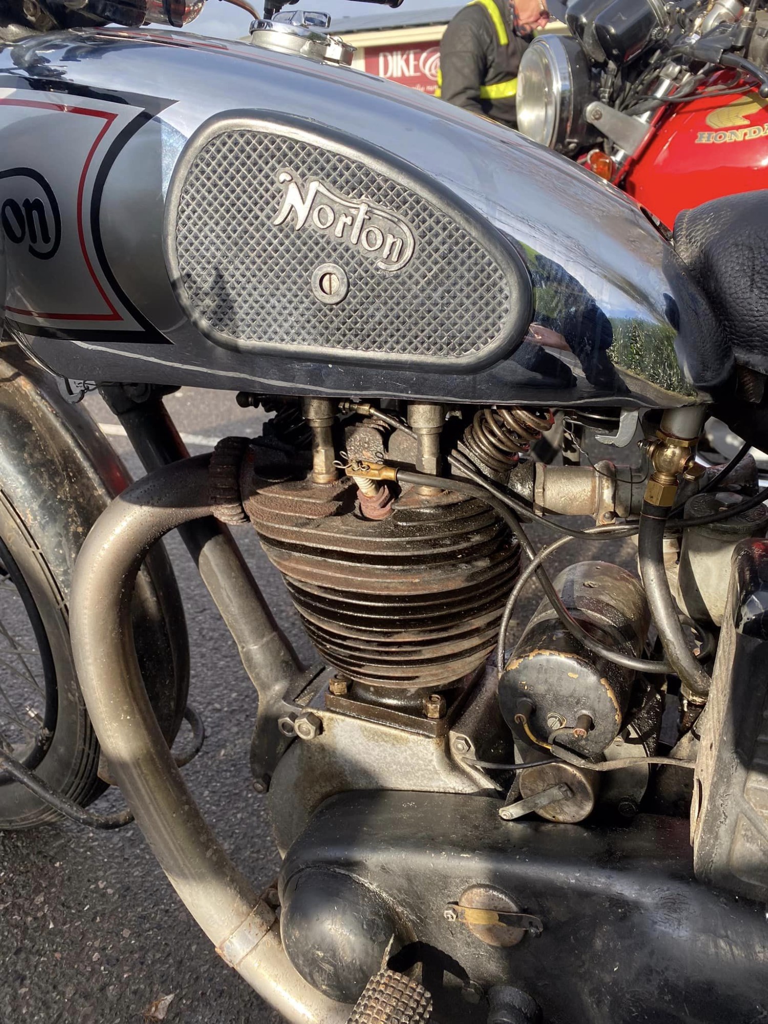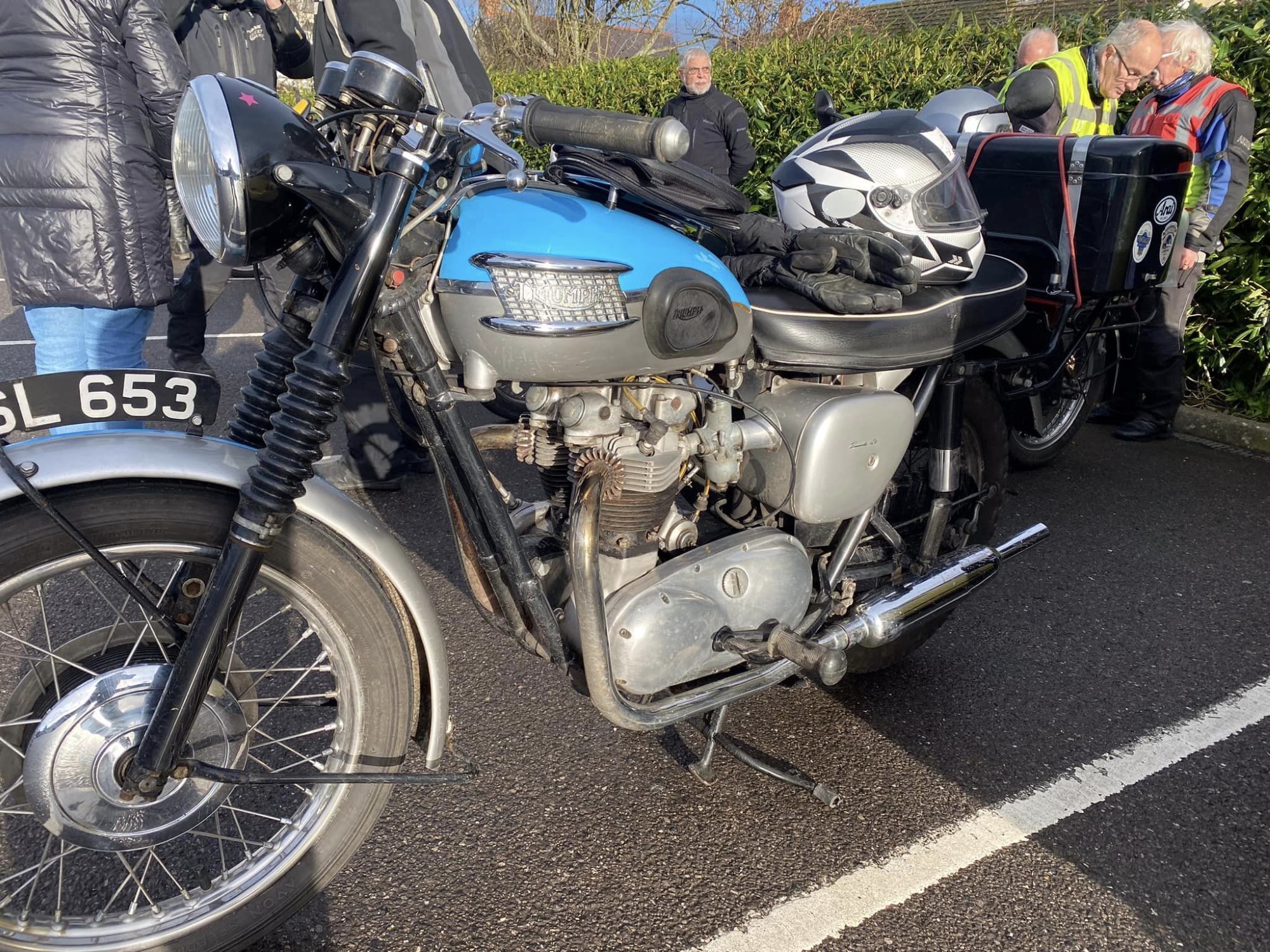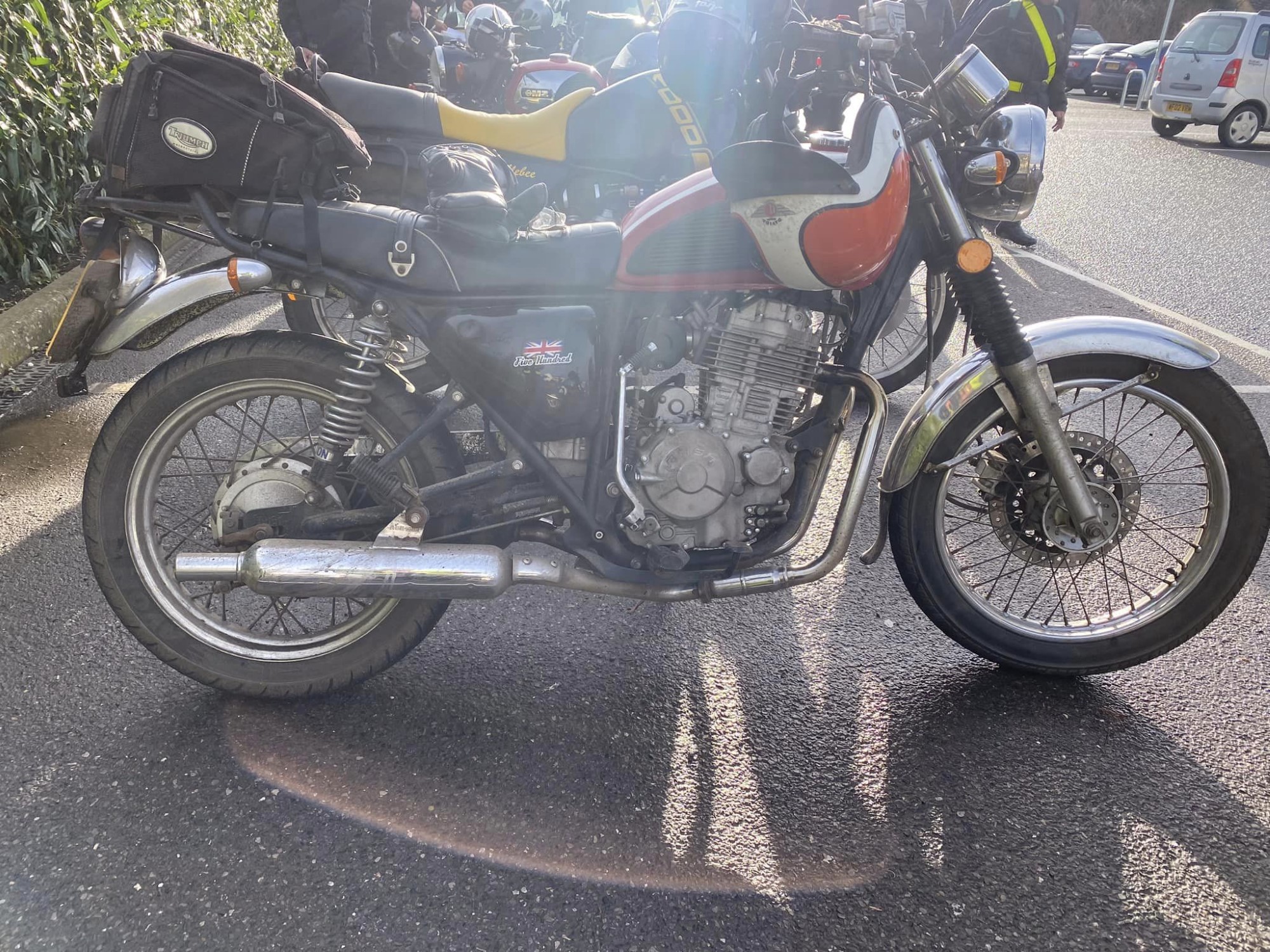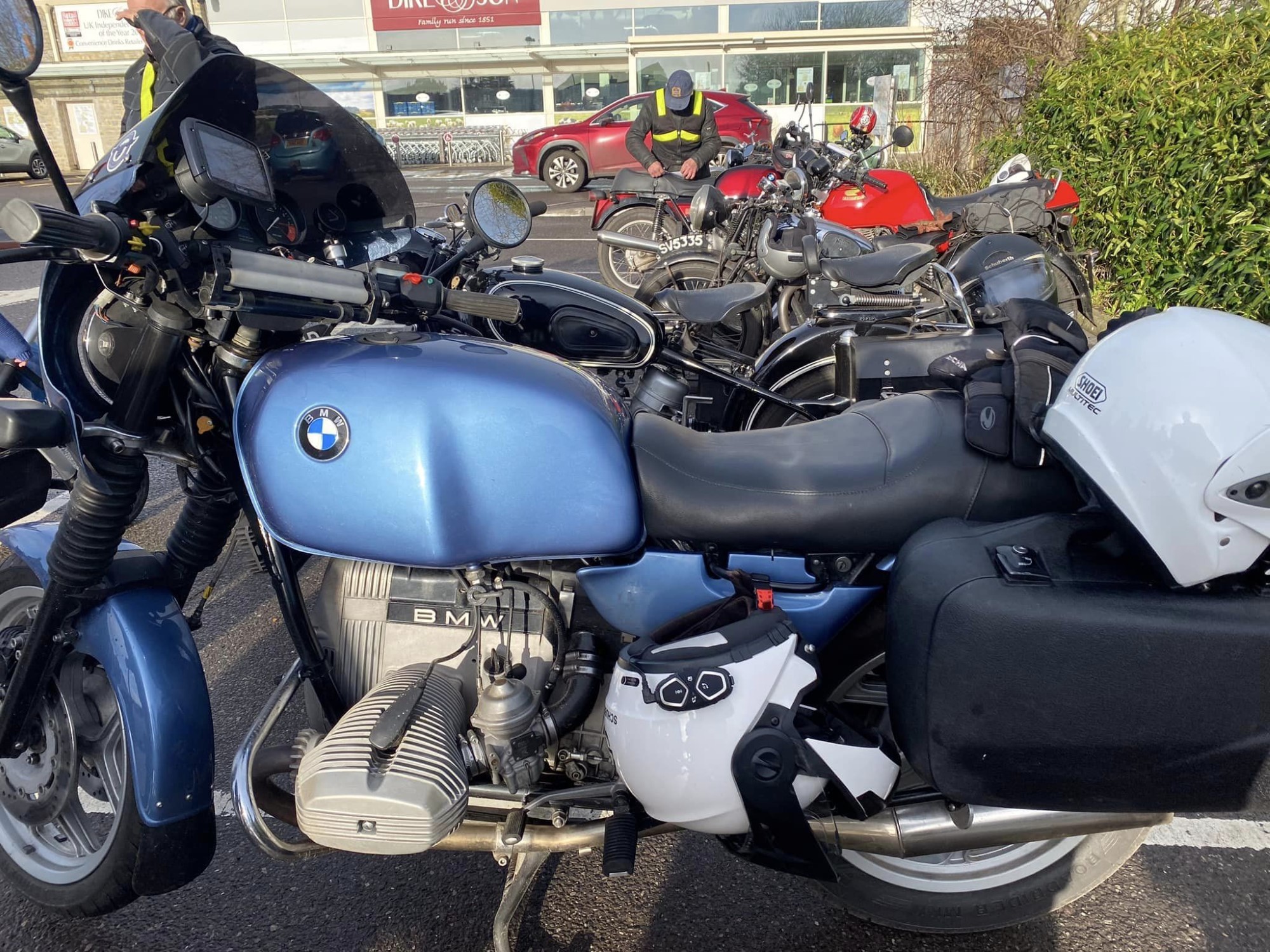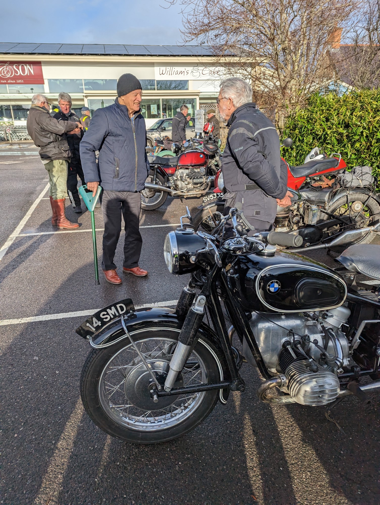 A surprisingly good turn out, 17 signed on at Dikes supermarket car park. The weather had been pretty grim leading up to Sunday, So much so that I revised my route to avoid two planned river bridge crossings and one ford. The ford was at Fifehead Neville so we crossed the river Diveilish further upstream via a bridge on Zore Lane. The first planned bridge being at Hammon which now has gates to prevent crossing when the river Stour is in flood. We went via Child Oakford to Manston. The second Stour crossing was to be at Trill bridge, a tributary of the river Stour on the road to Stour Row, so we preceded further north to loop round to Stour Row. I know Trill bridge well. When route planning a couple of years ago I came a cropper in flood water there. When I checked the route this year there was significant surface water on the main road to Shaftsbury, hence the red warning on my route sheet. This had dispersed but we found rather a lot of surface by Henstridge Airfield. So, it did not rain until we got back to Dikes but with all the surface water it was a good test for the quality of waterproofing of your ignition system!